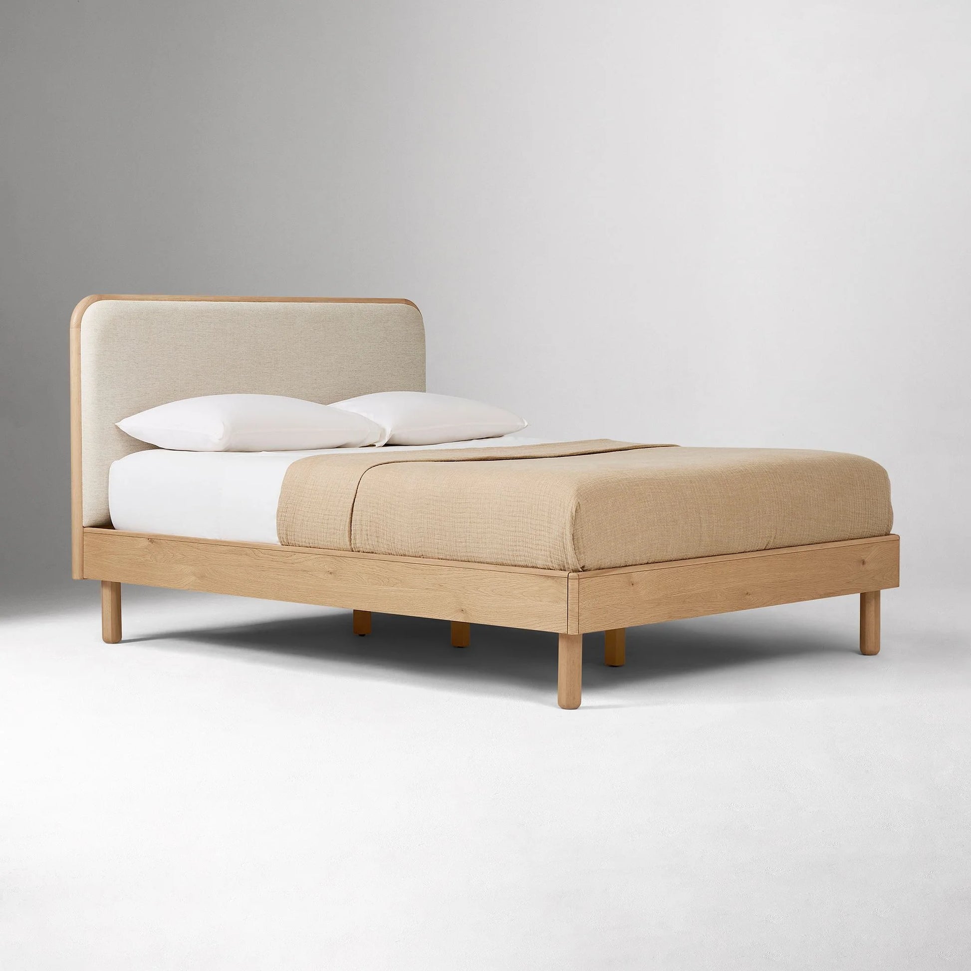 The Linoa Bed combines modern softness with grounded natural tones. Crafted from warm oak wood, its minimalist frame is balanced by a rounded-edge upholstered headboard in a creamy linen fabric, offering both visual calm and comfortable support. Clean lines, cozy texture, and timeless proportions make it an inviting centerpiece for any serene bedroom.
